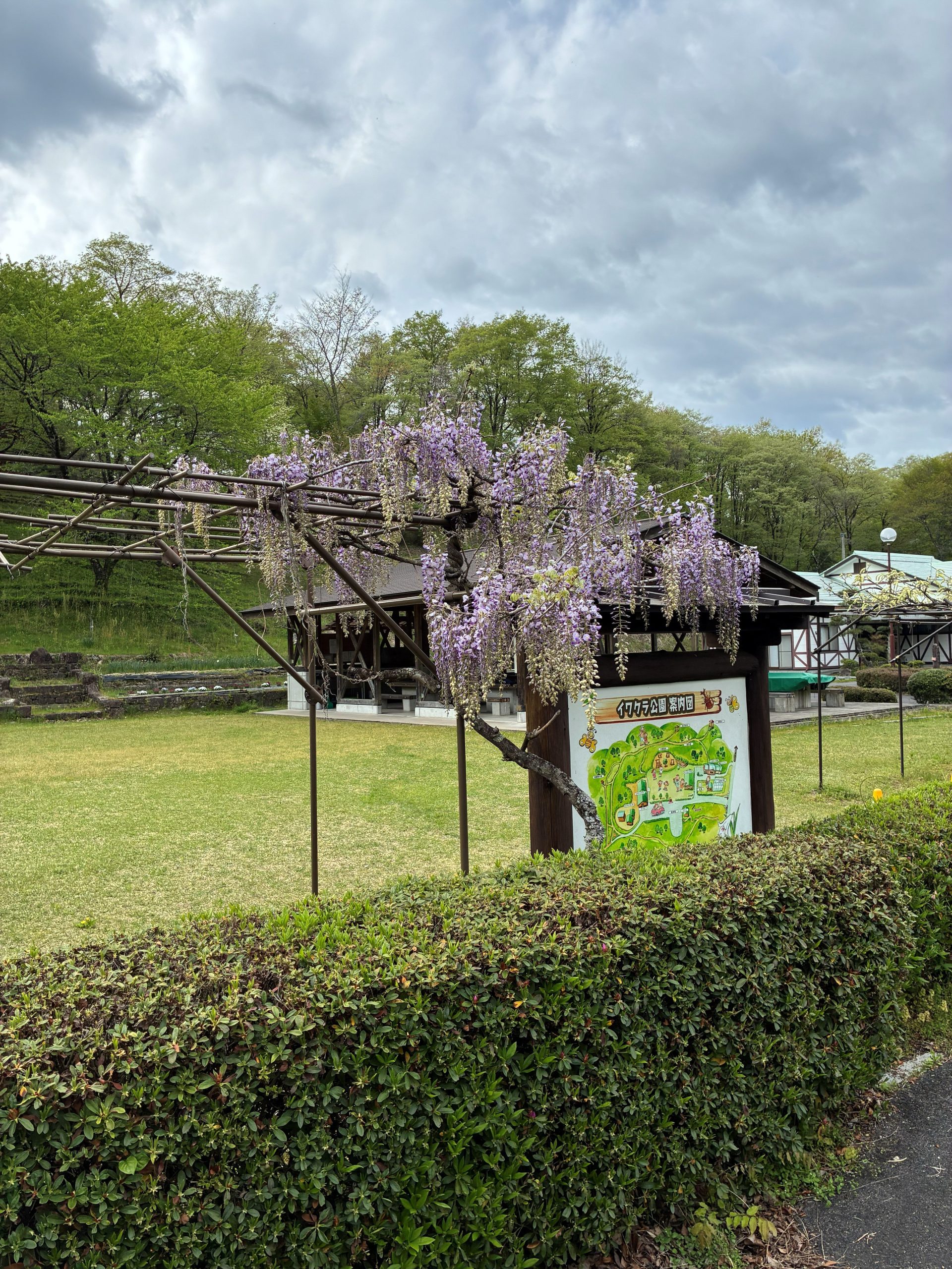 イワクラ公園の藤棚の紫の花が咲き始めました。