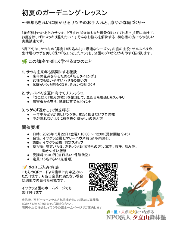 持ち物 剪定バサミ、刈込バサミ(お持ちの方)、軍手、帽子、飲み物
